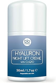 Crème de nuit d'acide hyaluronique. Crème hydratante anti-âge et anti-rides grâce d'ingrédients végans et naturels. Peptides, Hyaluron, CoQ10, AHA et Acide Glycolique. Pour hommes et femmes. 50 ml